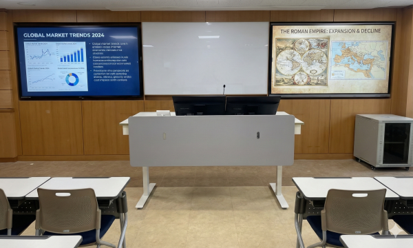 선명한 화질과 스마트 제어의 조화 좌우 86인치 4K 대형 TV로 압도적인 선명함을 제공하고, 중앙 유리칠판으로 판서 강의를 완벽하게 지원합니다. 원터치 UI 하나로 강의 시작/종료, 입력 전환, 음향 조절, 카메라 프리셋까지 모든 기능을 한 번에 제어하여 효율적인 강의 환경을 구현합니다.